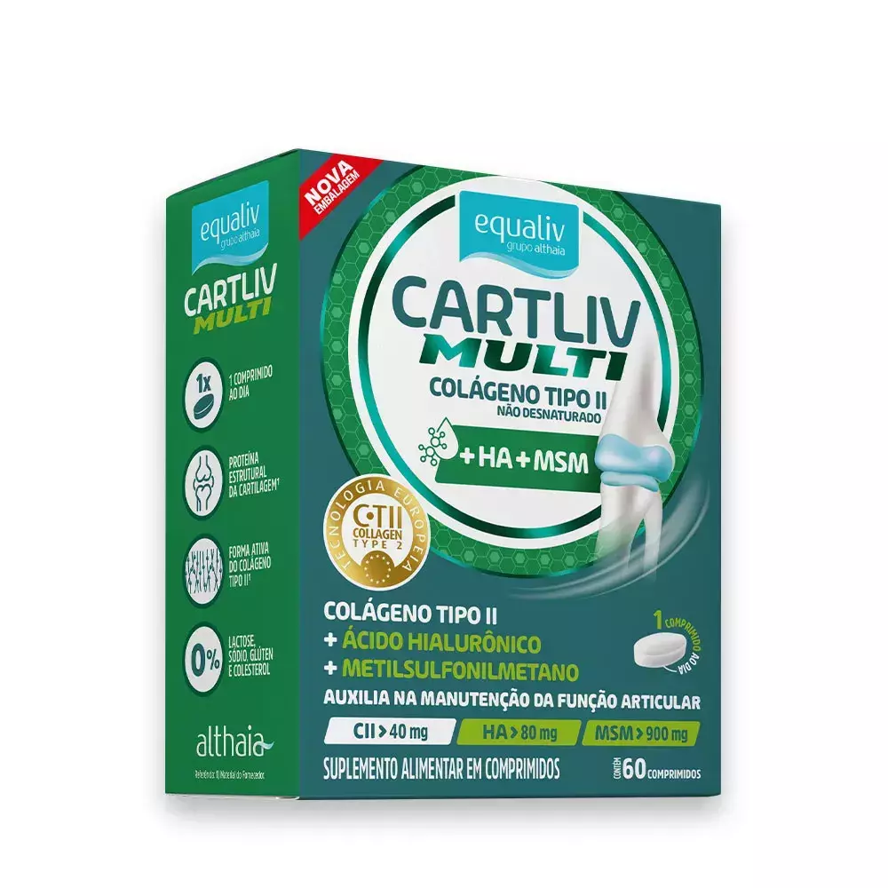 Equaliv Cartliv Multi associa os benefícios do colágeno tipo II nativo não desnaturado com ácido hialurônico, que tem como função a hidratação e lubrificação das articulações, e metilsulfonilmetano, que contém agentes naturais que auxiliam no processo de limpeza do sangue, o que reduz os processos inflamatórios. Além disso, suporta a mobilidade e auxilia na recuperaçãopós-exercício físico.