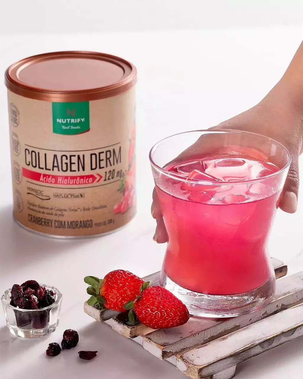 Colágeno hidrolisado, peptídeos bioativos de colágeno hidrolisado com peso molecular médio 2kDa (Verisol®), ácido ascórbico, mix de vitaminas e minerais (ácido ascórbico, acetato de DL-alfatocoferila, sulfato de zinco monoidratado, acetato de retinol, picolinato de cromo, selenito de sódio, D-biotina e colecalciferol), concentrado de rabanete e cenoura, hialuronato de sódio obtido pela fermentação de Streptococcus zooepidemicus, ácido ortosilícico estabilizado em cloreto de colina, acidulante ácido cítrico, aromatizantes naturais e edulcorante glicosídeos de esteviol de Stevia rebaudiana Bertoni. NÃO CONTÉM GLÚTEN.