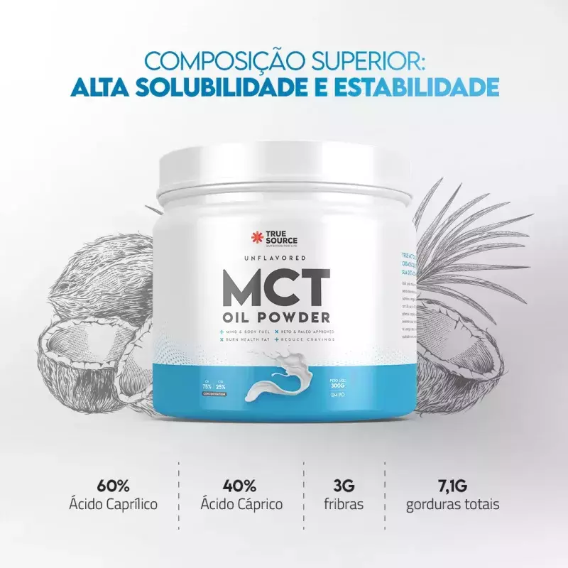 Com uma composição superior a muitas no mercado (75% de ácido caprílico e 25% de ácido cáprico), o produto confere uma alta solubilidade e estabilidade, podendo ser aderido a inúmeras dietas e receitas. O MCT POWDER é para quem procura definição, energia, foco e também para quem prioriza um produto de alta qualidade.